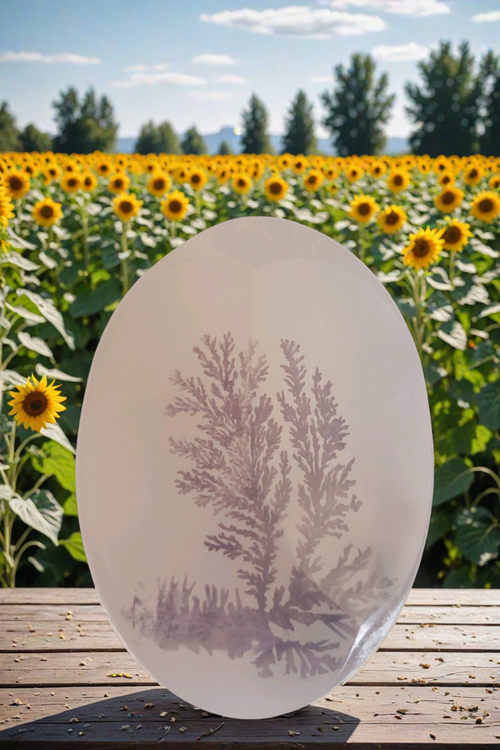 در دل این نگین بیضیشکل با زمینهای سفید و روشن، درختی تنها و تیرهفام خودنمایی میکند؛ نمادی از استقامت و سکوت در میان روشنایی. ترکیب رنگ سنگ با گلهای آفتابگردانی که در تصویر پسزمینه خودنمایی میکنند، حس تعادل میان قدرت و لطافت طبیعت را به بیننده منتقل میکند.
