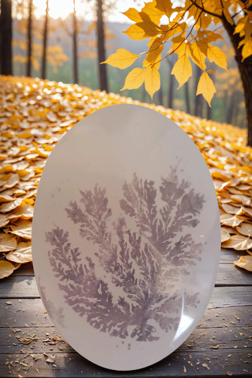 این نگین بیضیشکل با ابعاد ۱۸×۲۵ میلیمتر، تصویری از درختی تنها و ایستاده را در خود دارد که دو شاخهی آن به موازات یکدیگر رشد کردهاند؛ طرحی متوازن، ظریف و چشمنواز. زمینه سفید سنگ، جلوهای شفاف به فرم درخت داده و تصویر برگهای ریخته در پسزمینه پاییزی، حال و هوای عمیقی از گذر زمان و آرامش را تداعی میکند.